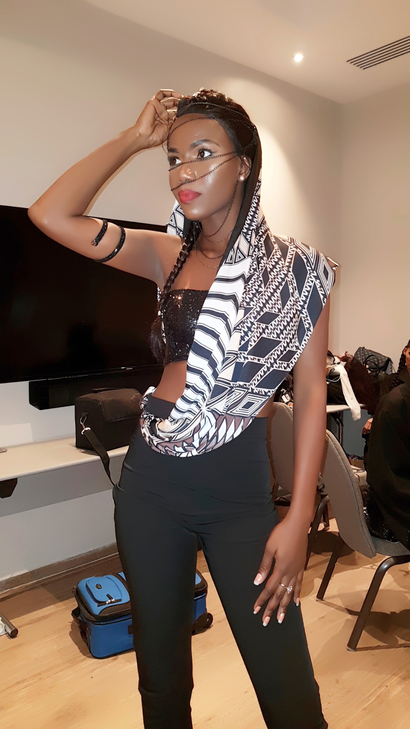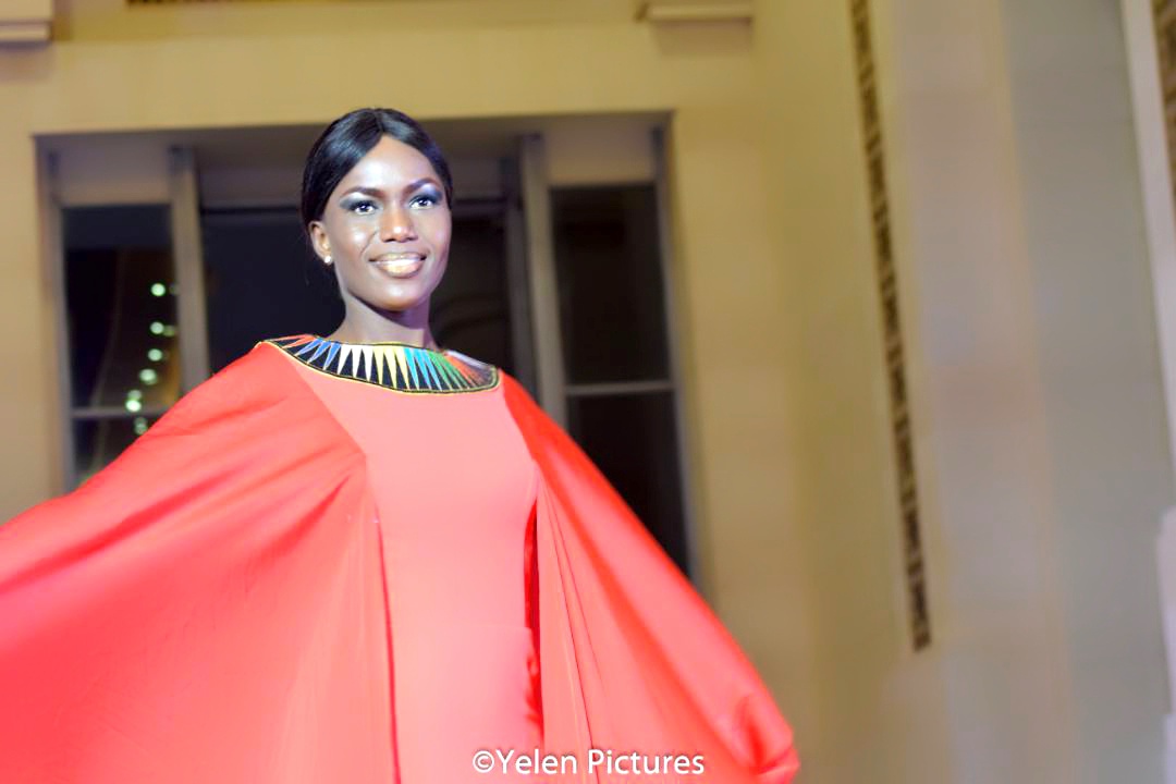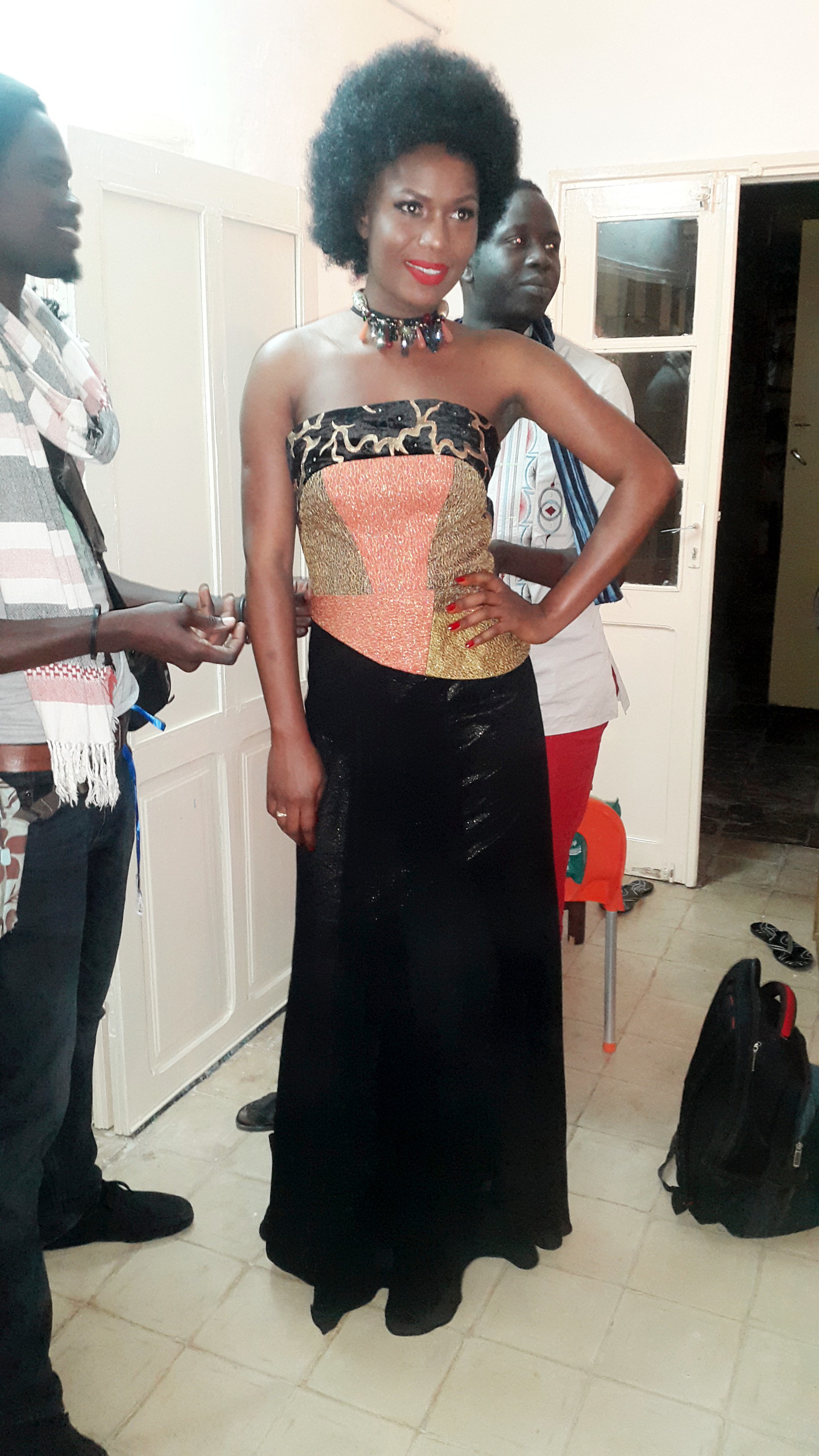 Maeva affiche un tour de hanches parfait, et c’est un plaisir des yeux d’épier les expressions de sa taille ciselée par le corset qu’elle porte. Son cou d’antilope dégagé, mis en valeur par une jolie robe dont les manches recouvrent harmonieusement les épaules, est un des beaux tableaux de la création qu’accentue la naissance d’une gorge discrète articulée, à l’occasion d’un des défilés, d’un charmant contour de dentelle. On parlera encore de son visage mignon, de son nez fin, de ses pommettes hautes surtout quand elle vous sourit généreusement, entre ses boucles d’oreille rouges et sa coiffure afro… Si on continue la description physique, on en arrive à vous prouver qu’elle porte du «M», taille qui valse et se comprime entre 34, 36 ou 38. Vous la voyez porter un jean et vous avez un désir irrépressible de cheminer avec elle dans un conte de mille et une nuits… de défilé. «Malheureusement, j’ai pas encore fait de voyage hors du pays. J’ai fait juste quelques régions du pays», justifie-t-elle pour ne pas édulcorer le rêve.
