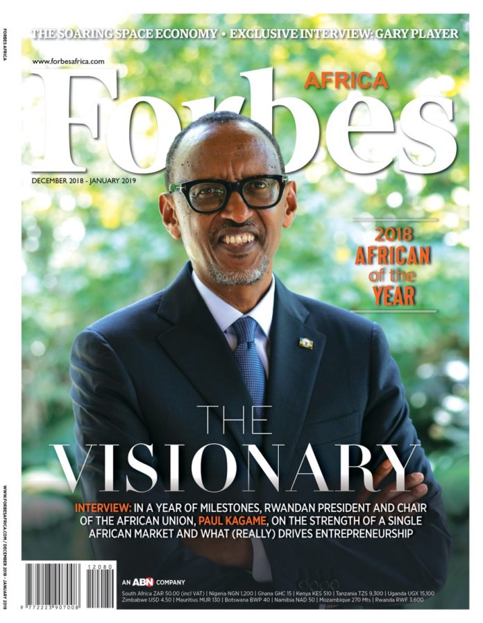 Dans ce double numéro de décembre 2018 et janvier 2019, le chef de l’État rwandais et président en exercice de l’Union africaine est en couverture, souriant, détendu, les bras croisés sur un fond vert qui n’est pas sans rappeler le « pays des mille collines ». Dans les pages du magazine, une longue interview du dirigeant rwandais de 61 ans permet de saisir sa pensée au moment où il achève son mandat à la tête de l’UA. En plus d’être décrit comme un visionnaire pour l’Afrique, Paul Kagame, père de quatre enfants, est surtout présenté comme l’homme qui a travaillé ces vingt dernières années à replacer son pays au centre du jeu, juge le magazine en kiosque depuis le 6 décembre. Avec cette couverture, Paul Kagame est également lauréat du prix de l’Africain de l’année décerné par All Africa Business Leaders en association avec la chaîne CNBC Africa. Le prix, qui honore les dirigeants pour leur contribution à l’économie africaine, a été remis le 29 novembre 2018. Avec plus de dix catégories, ce prix se distingue comme l’un des plus prestigieux d’Afrique.