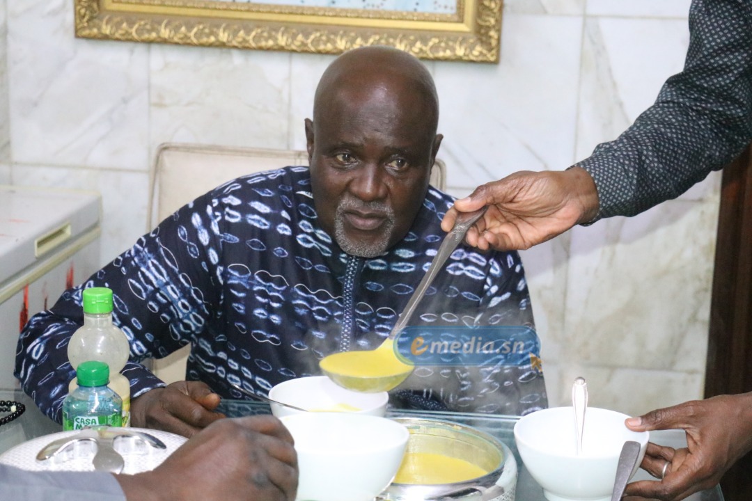 Quelques invités. La famille. Les enfants ont les yeux rivés sur le match Liverpool-Villarreal. On est à quelques minutes de l’heure de la rupture, mais, tout est presque fin prêt. Pour le plaisir des yeux, il y a une table bien dressée avec de petites bouteilles d’eau minérale bien rangées. Quelques minutes après, Marie Lô fait des va-et-vient pour superviser si tout est en place avant de ranger dans des assiettes de marque, les croissants, du pain de mie, du pain, du thon, des œufs brouillés, des crudités sans compter les bouteilles de jus naturel, etc. L’artiste, visiblement très content, égrène son chapelet, mais de temps en temps, il jette un coup d’œil vers la cuisine. La soupe qu’il est en train de concocter, confirme que l’homme ne sait pas faire que chanter. Sur la table à manger, les thermos d’eau chaude, de kinkeliba au goût de citronnelle, sont déjà sur place. A 19h 20, l’heure de la rupture se rapproche, l’odeur de la soupe embaume la maison. Marie, installée au niveau du jardin, grille des poulets. Dans un coin de la maison, avec un petit fourneau, un jeune prépare le thé. 19 h 26, c’est l’heure de la rupture. L’artiste met tout le monde à l’aise. Il a, toutefois, les yeux rivés sur sa télévision. Quelques minutes plus tard, le buffet est ouvert. C’est le self-service. L’artiste prend une tasse de kinkéliba bien chaude, avant la prière du crépuscule qu’il a lui-même dirigée dans une mosquée construite à l’intérieur de la maison. Après la prière, place à la dégustation de la soupe bien chaude avant d’accomplir la dernière prière de la journée et les prières surérogatoires. Cette recommandation divine accomplie, le diner peut être servi. Les hôtes ont eu droit à un succulent plat de riz au poisson accompagné de gambas. Que dire du dessert! Mangue, ananas, corossol…rien n’était de trop pour faire plaisir aux invités. Un vrai ndogou royal.