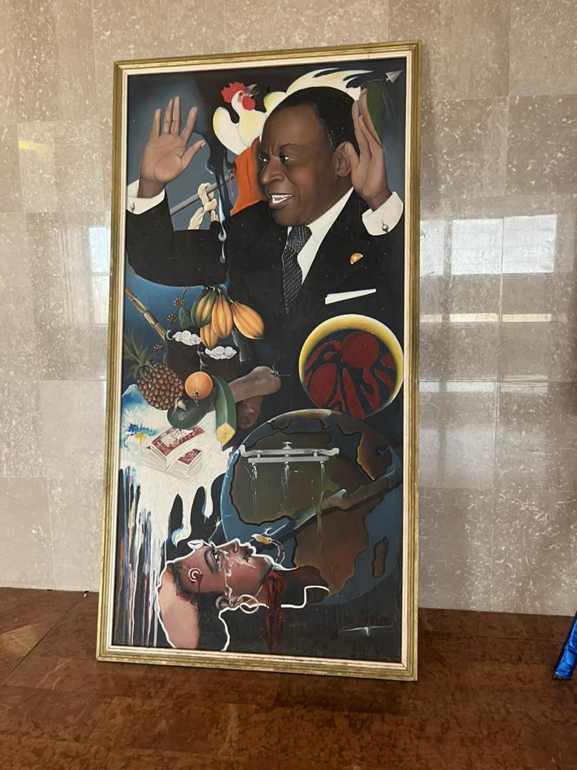 L’espace est très grand dégage. Une fraîcheur et une bonne odeur s’en dégagent. Une grosse toile en dessein avec pleins de représentations, des couleurs allant du bleu, au blanc, en passant par le rouge, est accrochée sur le cimaise. C’est une œuvre du professeur d’art plastique du lycée scientifique du nom N’Guessan Toma qui a fait ce don pour la galerie. Dans cette toile, il peint Houphouët en habit traditionnel, en contraste avec un homme moderne symbolisé par le chapeau qui porte l’emblème de la famille, le bélier. Avant qu’il ne soit Président de la Côte d’Ivoire, depuis 1940, il a été chef de Canton de Yamoussoukro. Ce qui lui a permis d’avoir de grande surface de terre pour travailler le pays.