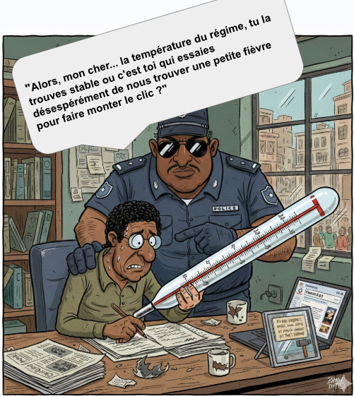 La caricature : 'Un journaliste est assis à son bureau, l'air anxieux, écrivant un article avec une plume géante en forme de thermomètre médical. Derrière lui, un policier imposant, portant des lunettes de soleil opaques, se penche sur son épaule. Le policier pointe le thermomètre du doigt et demande d'un ton faussement mielleux : "Alors, mon cher... la température du régime, tu la trouves stable ou c'est toi qui essaies désespérément de nous trouver une petite fièvre pour faire monter le clic ?" Sur le bureau du journaliste, on voit un petit panneau : "En cas d'urgence, brisez la vitre et appelez mon avocat (et Tract Hebdo)'