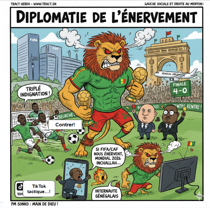 Tract Hebdo – On connaissait la « diplomatie du dollar », celle du « gros bâton », ou même la très feutrée « diplomatie de la téranga ». Mais un internaute sénégalais vient d’inventer, sur TikTok (ce haut lieu de la pensée géopolitique mondiale entre deux chorégraphies langoureuses mais syncopées de Wally Seck), une doctrine révolutionnaire : la diplomatie de l’énervement. Le message est clair, net et sans bavure : « Si la FIFA et la CAF continuent de nous énerver, le Sénégal va remporter la Coupe du Monde 2026…Inchallah !»