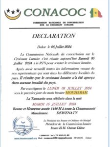 Tract-La Tamkharite sera célébré le mardi 16Juillet 2024, annonce la Commission Nationale de concertation sur le Croissant Lunaire (CONACOC) qui s’est réunie ce samedi 06 Juillet 2024 à la RTS pour scruter le croissant lunaire.« Après avoir recueilli toutes les informations venant de nos représentants qui sont dans les différentes localités du pays, Il résulte que le croissant lunaire n’a été aperçu dans aucune localité du pays », informe la CONACOC.Par conséquent le lundi 08 juillet 2024 sera le premier jour du mois lunaire Mouharam. « La Tamxarite sera célébrée dans la nuit du mardi 16 juillet 2024 », lit-on.[REPORTAGE ‘TRACT’] JEUNESSE/VACANCES SCOLAIRES 2024: Des écoliers, sans cachotteries, confient à Tract le programme de leur vacances à la hawaïenne